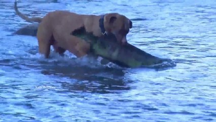 brown pitbull dog riding whale vintage